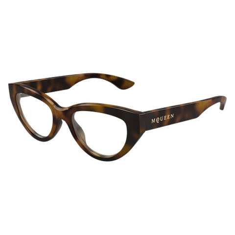 A story defined by bold acetate fronts and injected temples. Feminine cat-eye shape. The McQueen logo is elegantly presented as a metal sticker on the temples.